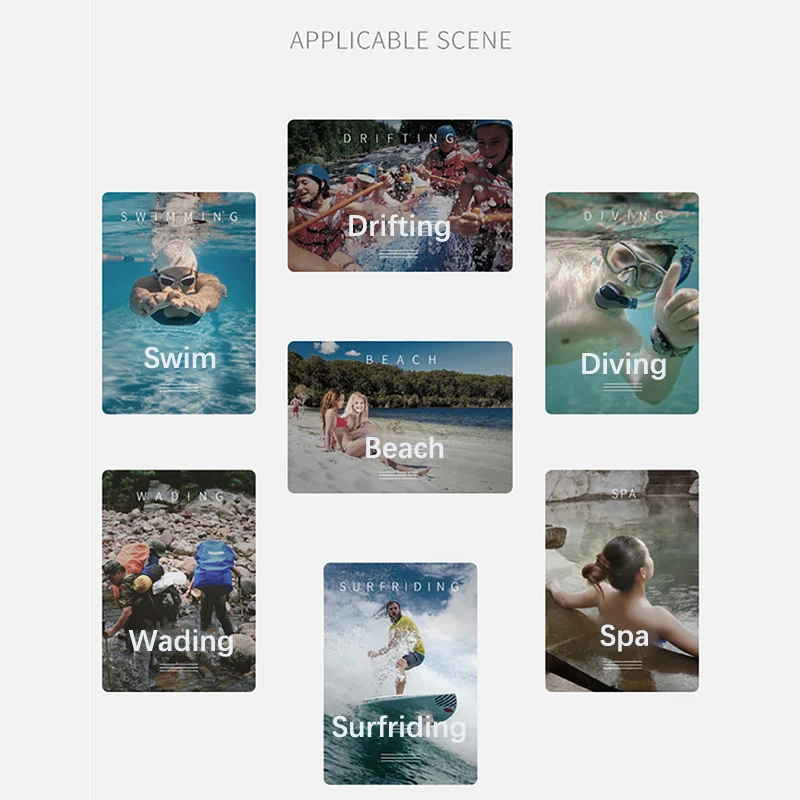 4. Uso multifuncional: Este saco impermeável é adequado para várias atividades aquáticas, como natação, mergulho, rafting, caiaque, surf e atividades de praia, e também para uso diário, como o banho e a corrida.